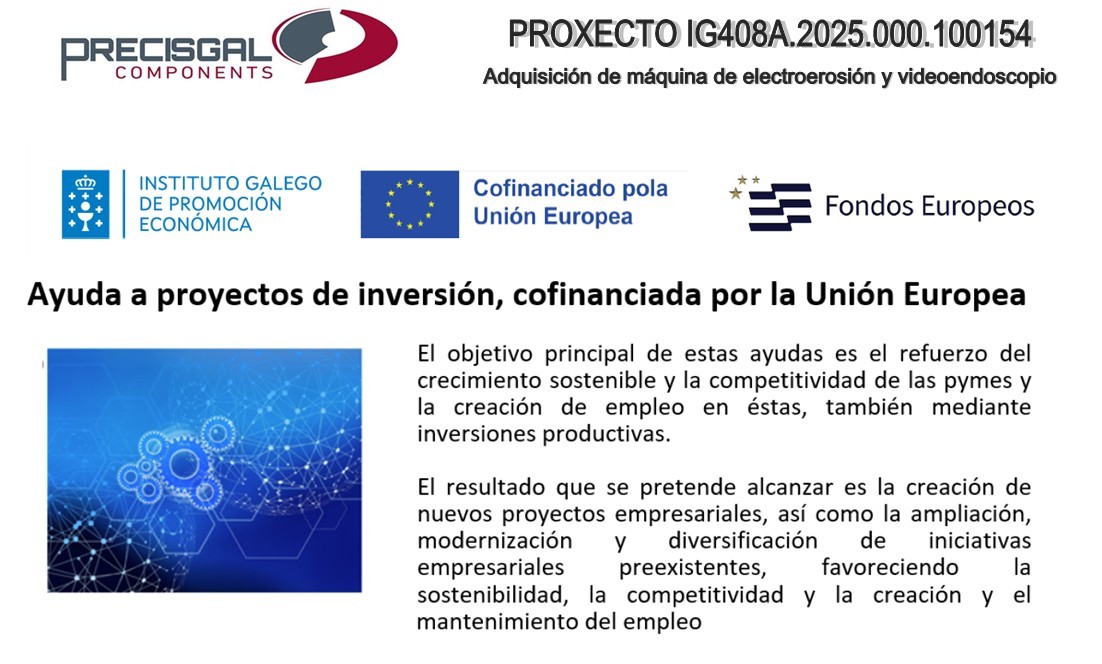 Como apoio ao proceso de Axuda as inversions en equipos productivos, ā€œPRECISGAL UTILLAJE, SL.Uā€, ten unha axuda concedida pola Xunta de Galicia a través do IGAPE cofinanciada polo Fondo Europeo de Desenvolvemento Rexional, no marco do programa Operativo FEDER Galicia 2014-2020